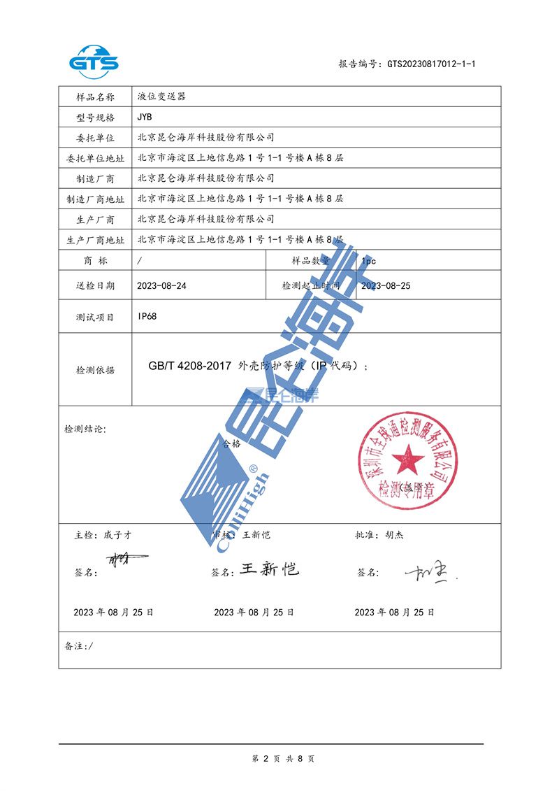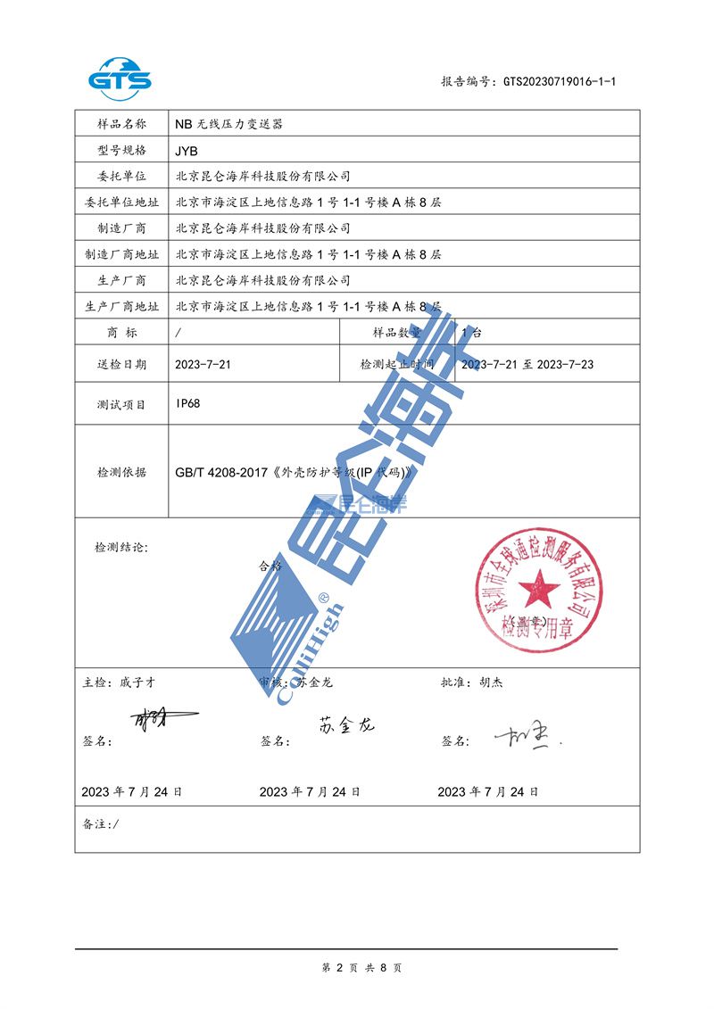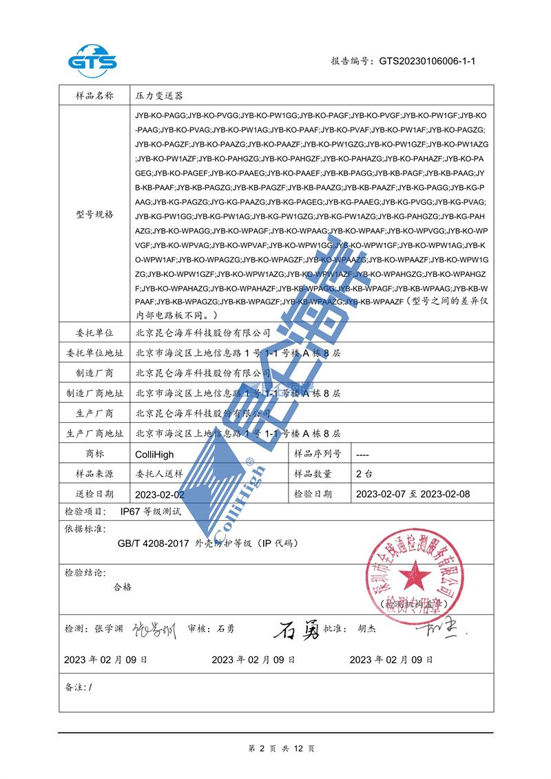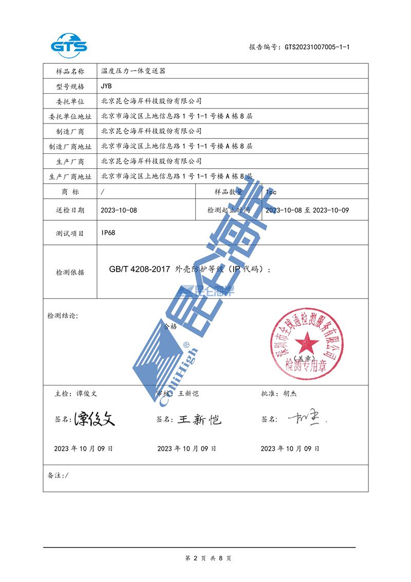 JYB温度压力一体变送器防护等级IP68检验报告02