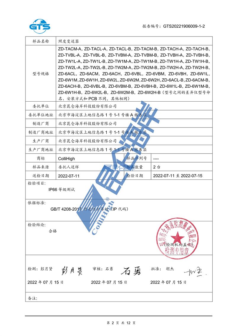 ZD-T ZD-6 照度变送器 IP66防护等级检测报告