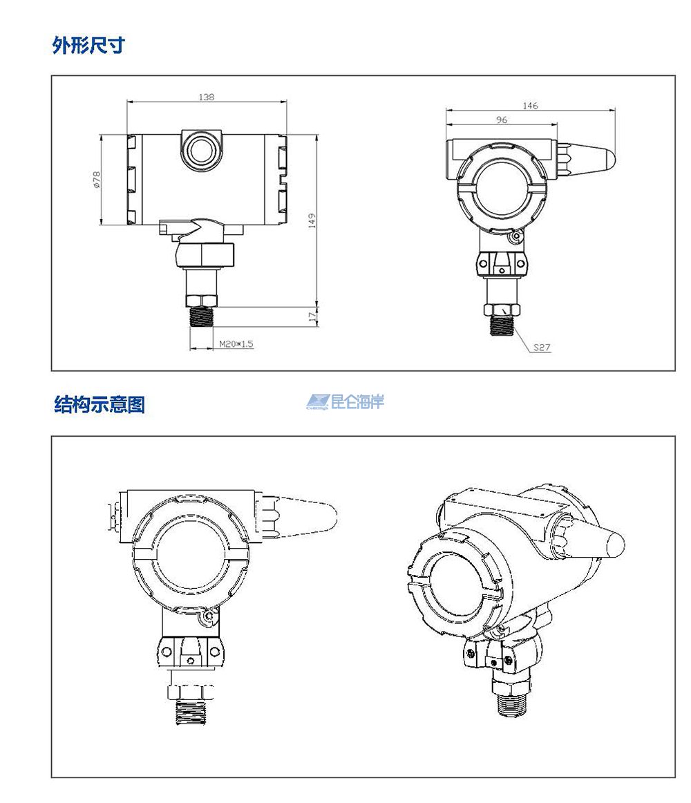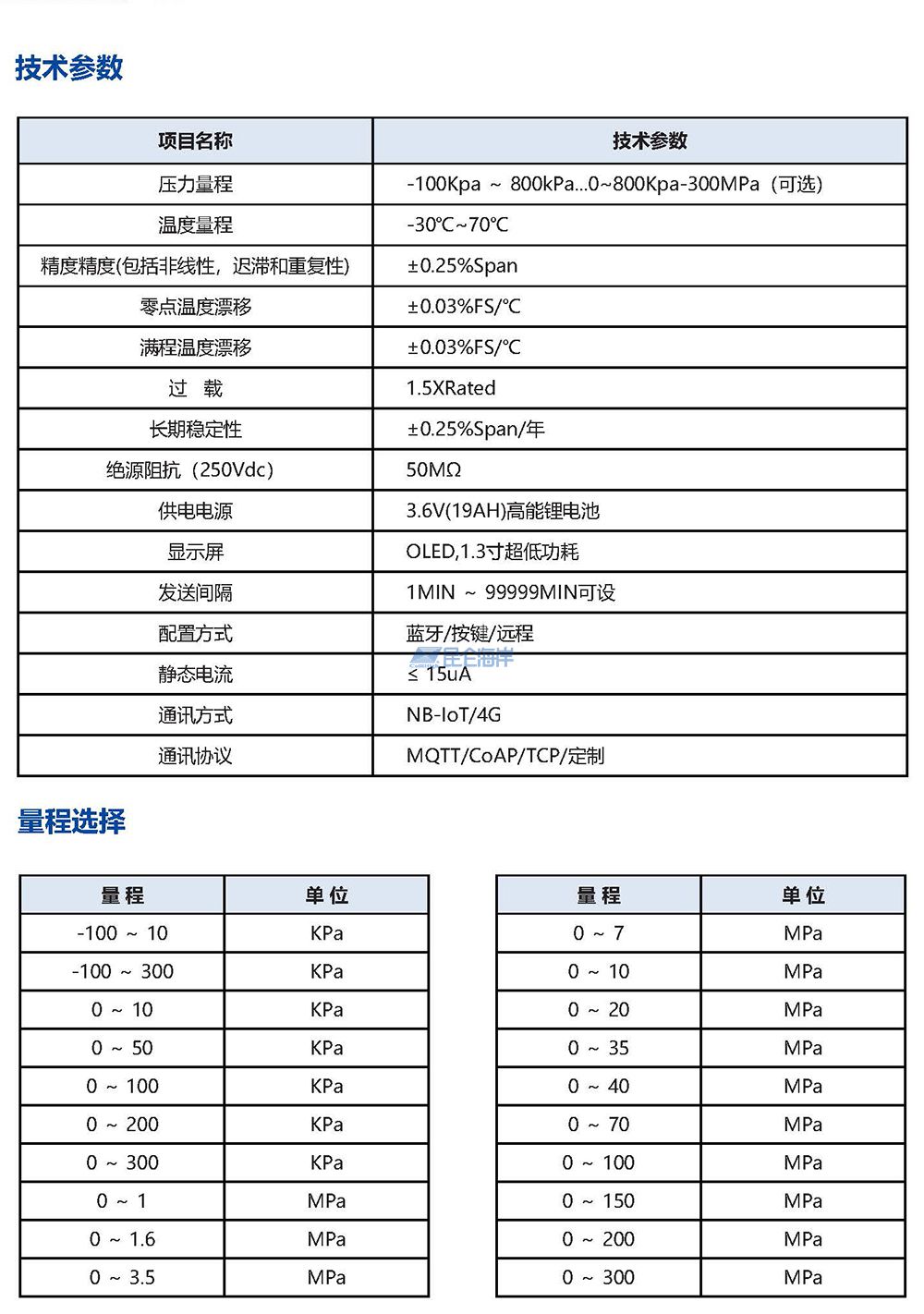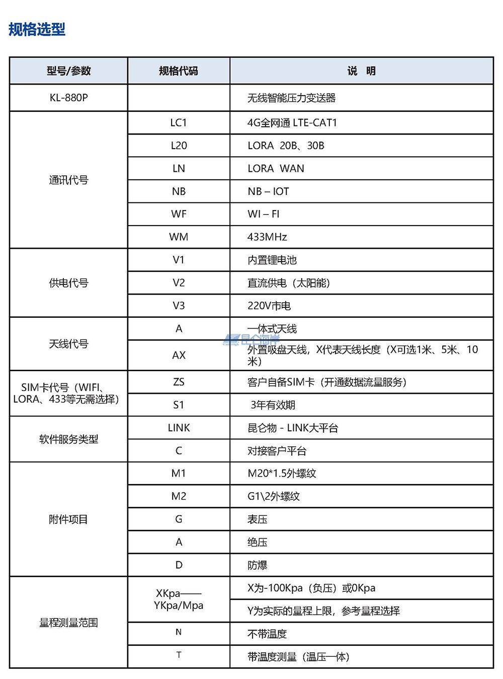 KL-880P型无线智能压力变送器是一款低功耗、采用高能锂电池供电,具有无线通信功能的智能监测仪表。该仪表采用微熔压力传感器或者扩散硅芯体作为压力信号测量元件,采用24位高精度AD转换器采集压力、温度信号,实现了对变送器 进行宽温度范围的零点和温度性能补偿。