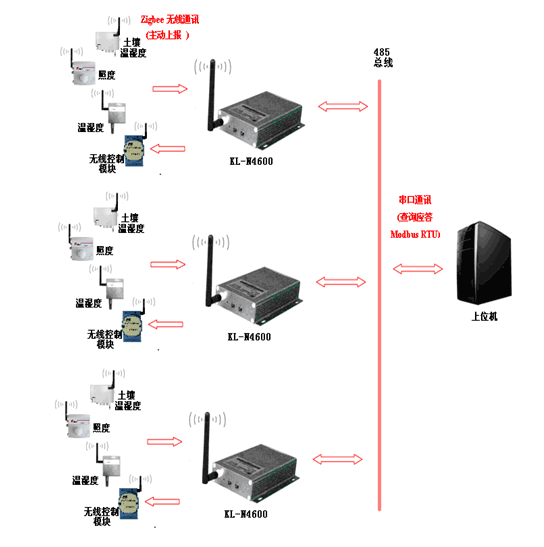 本系统是采用的无线采集传感器和控制器,通过zigbee传输到KL-N4600模块上,通过KL-N4600模块接入计算机系统。每个大棚可以设一个(多个)4600模块和需要检测的若干个无线传感器(大气温度、大气湿度、土壤水份、光照强度等)。多个大棚内的4600模块通过RS485总线连接到计算机,所有的控制都是要上位机发出控制命令来实现的。