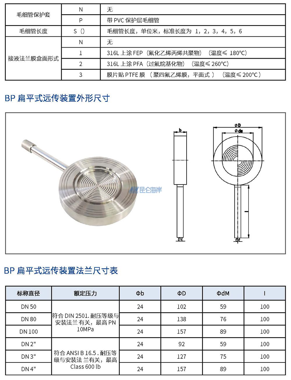 JYB-820PT型法兰安装式智能压力变送器在结构上,由表压/绝压变送器和经焊接安装的带毛细管的远传法兰组成。作用在远传法兰侧的压力,首先经远传法兰上的膜片和填充液,再经毛细管,最后到达测量传感器的测量端。然后将压力信号转变成4~20mA DC电流信号输出。
