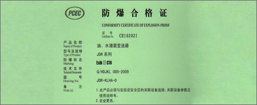 防雷、防爆特性可靠的接地线设计,变送部分能经受2000V脉冲的冲击。采用防爆材质外壳,符合GB3836.1-2000以及GB3836.4-2000标准。