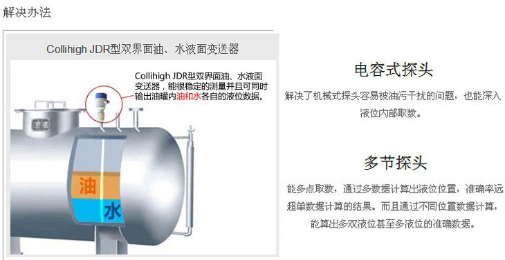 最高精度2cmCollihigh JDR型双界面油、水液面变送器采用多节探头设计,最高精度可达2cm,对一般油罐应用完全够了。