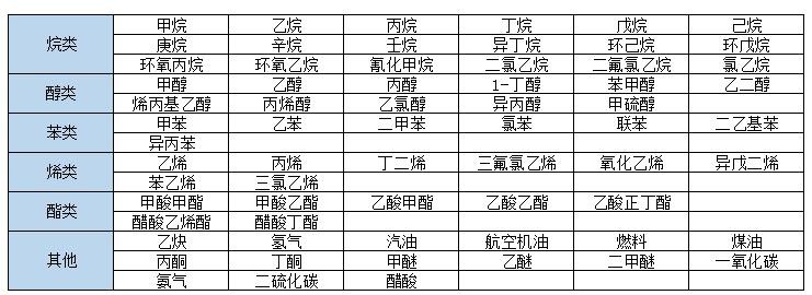 可测可燃气体一览表:(其他可测气体,本表不包含的可联系销售人员定制)