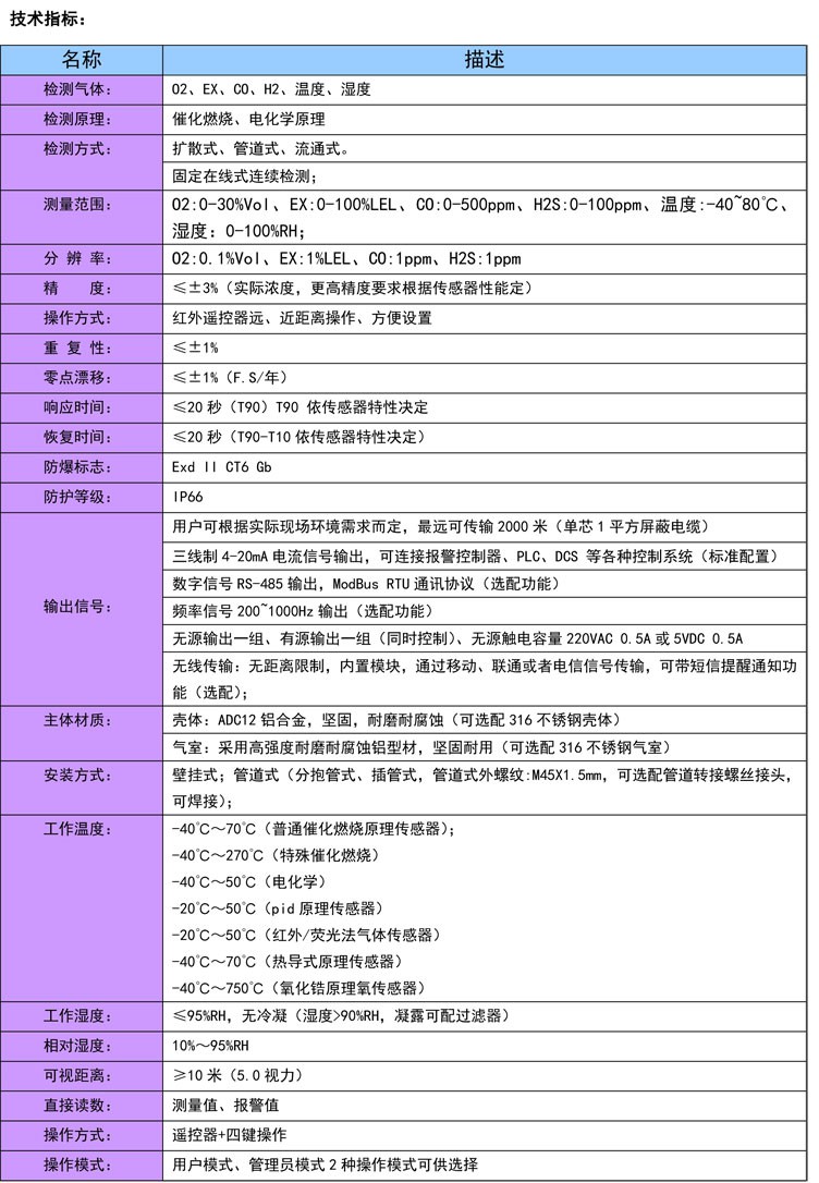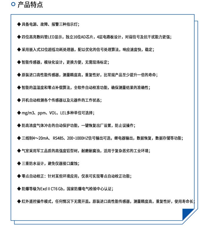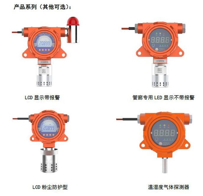 400-815-8881 管廊固定式探测器采用LED显示、常规橘红色外壳突显专业气质。检测气体类型可以随时更换(COH2SEXO2T&H),模块化设计,主板模块可更换,传感器全部采用原装进口。传感器模块可更换,维护方便。双路4-20mA及RS485输出设计,方便温湿度双模拟输出。 探测器带继电器无源输出和有源输出两路,方便接报警器、风机等外部设备。提供mg/m3、PPM、%VOL、%LEL四种单位显示,使用红外遥控器遥控控制,具有电源、故障、报警提示。具有优良的三重防水设计,可适用于管廊等恶劣环境中。传感器模块可自行更换,厂家出厂已经再带标定数据,探测器直接识别传感器型号和标定参数,方便后期维护和替换。