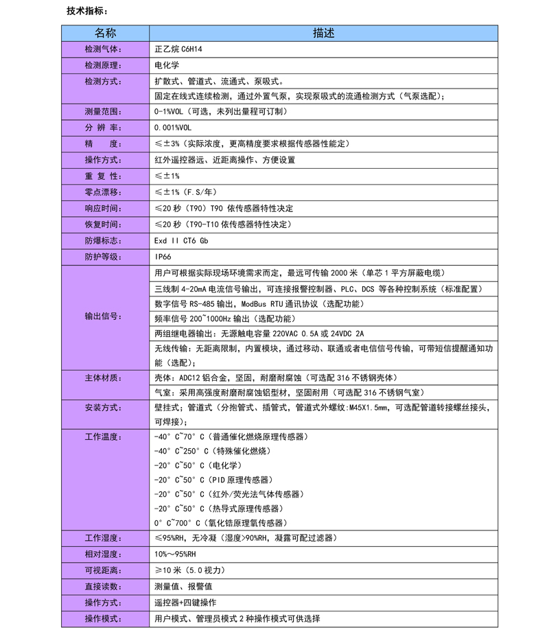 正乙烷C6H14固定式气体检测仪是8868登陆入口全新打造的一款气体检测仪,采用原装进口传感器及全新32位低功耗处理器; 仪表盘显示界面,数值与进度条同时显示,美观大方;电路采用4层布线,对弱信号及抗干扰更强;独立的高精度进口16位AD芯片及特有信号处理算法,测量数据精度更高更稳定;4~20mA、RS485、200~1000HZ多种输出信号可选择, 方便接入各种报警控制器、PLC、DCS等控制系统;防爆结构设计可应用在各种危险的工业场所。