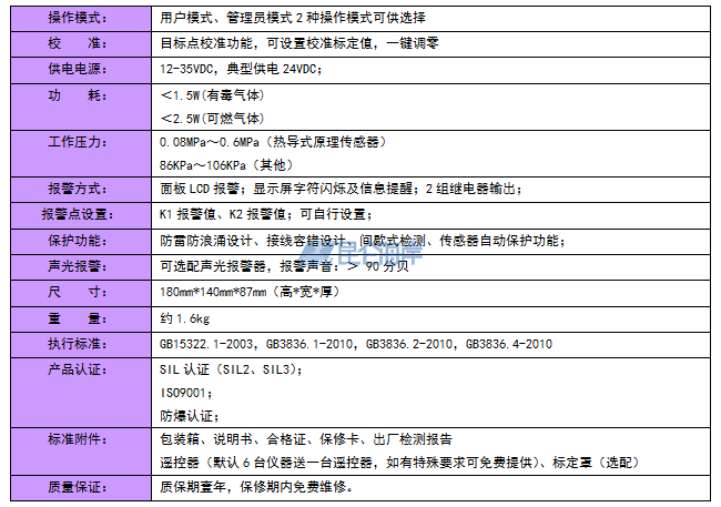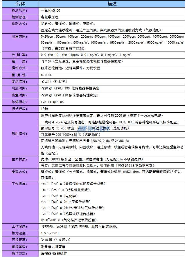 ◆ 采用独立16位AD芯片,4层电路板设计,对弱信号及抗干扰能力更强;◆ 采用嵌入式32位超低功耗处理器,配以优化的信号处理算法,响应速度快,稳定;◆ 智能的温湿度和零点补偿算法,全软件自动校准功能,确保测量结果的准确性;◆ 开机自动检测各个传感器以及元器件的工作状态;◆ 白、橙、红三色背光设计,正常、报警状态指示,一目了然;◆ mg/m3、ppm、VOL、LEL多种单位可选择;◆ 防高浓度气体冲击的自动保护功能,具有恢复出厂设置,防止误操作;◆ 三线制4~20mA、 RS485、200~1000HZ信号输出可选,继电器输出,数据恢复,数据存储等功能;◆ 一流的机械设计,气室采用军工品质的高强度铝型材,耐磨耐腐浊,适用于复杂恶劣的工业环境,合理科学的气室设计,保证传感器实时监 测的准确性;◆ 零点自动校正:针对某些环境应用,仪表可实现零点自动校正功能;◆ 防爆等级为Exd II CT6 Gb,国家防爆电气检验中心认证;◆ 红外遥控操作模式。采用人性化红外遥控操作模式。任何情况下无需开盖,确保易燃易爆环境中的安全使用。原装进口高性能传感器,测量精度高,重复性好,使用寿命长;