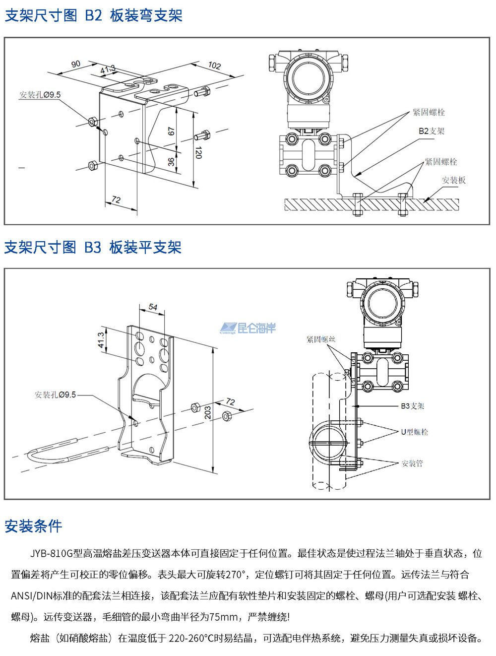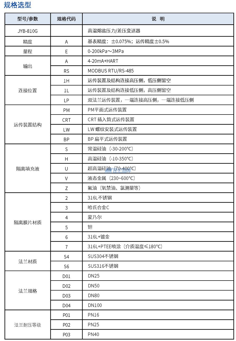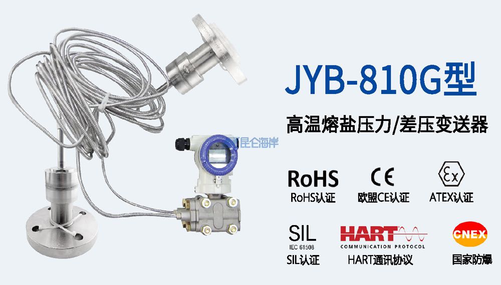 JYB-810G型高温熔盐压力/差压变送器是专门针对高温熔盐介质(如硝酸熔盐、氟化盐等,工作温度通常在200-600℃,甚至更高)设计的压力\差压测量设备,围绕耐高温、抗腐蚀、防堵塞、测量稳定等核心需求,采用液态金属作为高温压力传输介质,直接接入过程加热系统,实现高精度测量,经久耐用。