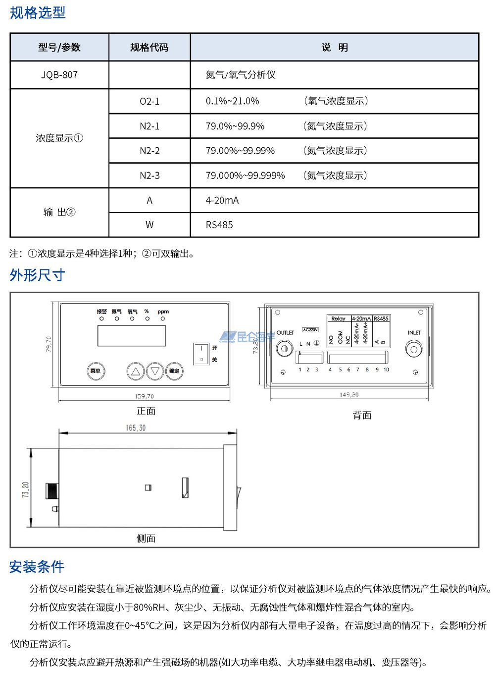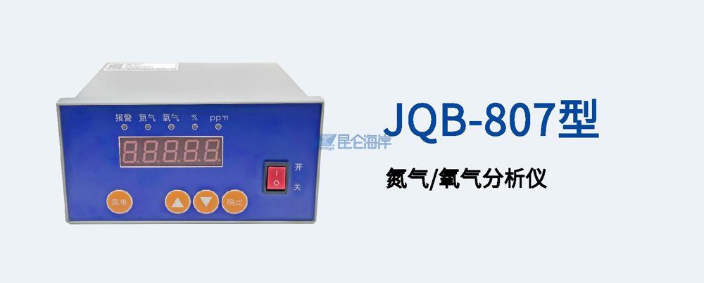 JQB-807型氮气/氧气分析仪采用高性能传感器为测量单元,经过微处理机对信号的处理,直接计算出氮气氧气混合气体中氧浓度值,并直接提供氧浓度值显示,或利用氧浓度值推算出氮浓度值后提供氮浓度值显示。