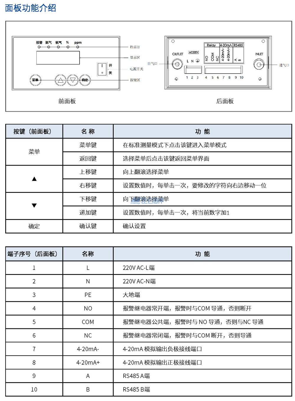 • 可根据氧气浓度推算出氮气浓度值,并提供相应显示;