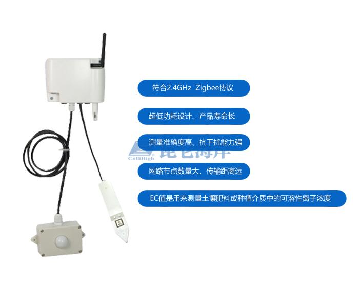 EC值是用来测量土壤中可溶性盐浓度的,也可以测量土壤肥料或种植介质中的可溶性离子浓度。EC值过高,可能会形成反渗透压,将根系中的水分置换出来,使根尖变褐或者干枯。EC值过高也会增大由绵腐病菌引起的根腐病的发生机率。传感器采集、传输一体化设计,可集成多种传感器及变送器,智能管理、智能传输。传输距离远,采用2.4G DSSS扩频技术,抗干扰能力更强。16物理信道可选,65535个网络ID可设,组网能力更强。
