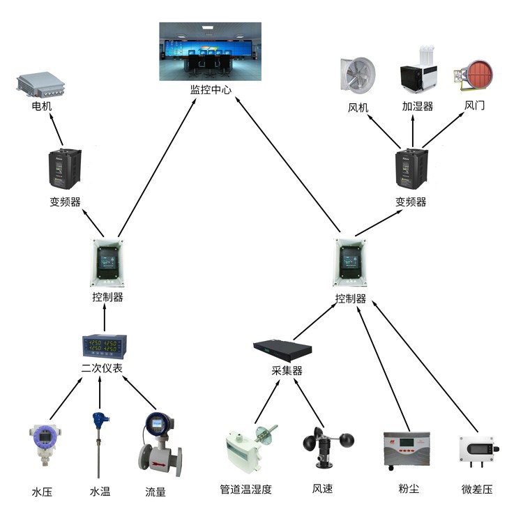 现场需要对机房空调水冷机组管道压力、温度、流量数据采集,将数据现场显示并传到后端控制器,实现对设备运行监控及能耗管理。另外对机房洁净度和室内外温湿度以及风管运行情况检测,以满足空调送风系统节能控制的需求。