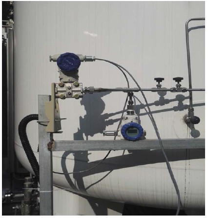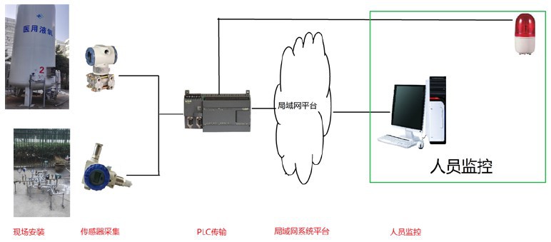 差压变送器用来监测罐体内氧气的液位高度,通过采PLC把数据传给后台平台,通过平台对氧气的使用量和液位进行预警;