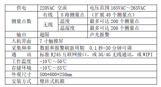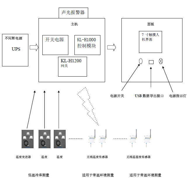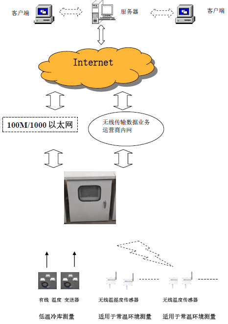 系统硬件主要由采集和通讯网关、带存储的触摸显示屏、声光报警器、前端温度变送器和云端数据管理软件构成,实现现场实时温度触屏显示、温度超限现场声光报警、温度检测数据现场存储、采集数据通过RJ45标准网络通讯接口或者3G/4G无线网卡等多种方式远传至监控中心,使监控管理人员直接在任何地方通过PC客户端观察到现场环境变化,或者对历史数据进行查询、分析。