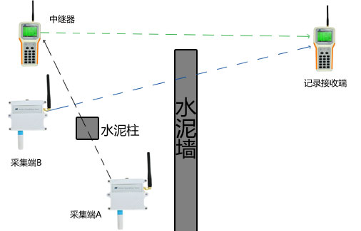 如果遇到大面积的水泥墙或者金属隔断必然阻碍采集端和记录接收端之间的信号传输时,可以利用中继器进行绕障设计,绕开障碍,实现信号正常传输。