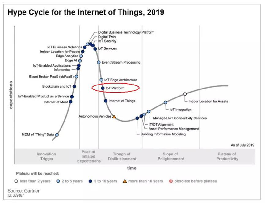 根据Gartner 2019 年发布的物联网技术成熟度曲线我们可以看到,在物联网发展的过程中,平台层已经逐渐剔除泡沫,在近几年将会走出稳步增长的发展趋势。
