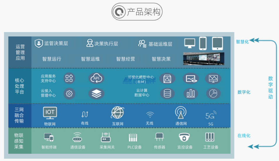 以物联网为基础,采用先进的BIM+、GIS+、互联网+、云计算与云服务、大数据、移动互联网等先进技术为利器,打造污水处理系统数字李生模型,在虚拟的数数字模型上,展开运营全过程的管理,打造智慧监管利器,实现各个环节的数字化,在线化、智能化,转型升级为信息化的工厂,将工业化和信息化的融合,提供运行、运维、经营、决策“四位一体”的智慧应用服务。