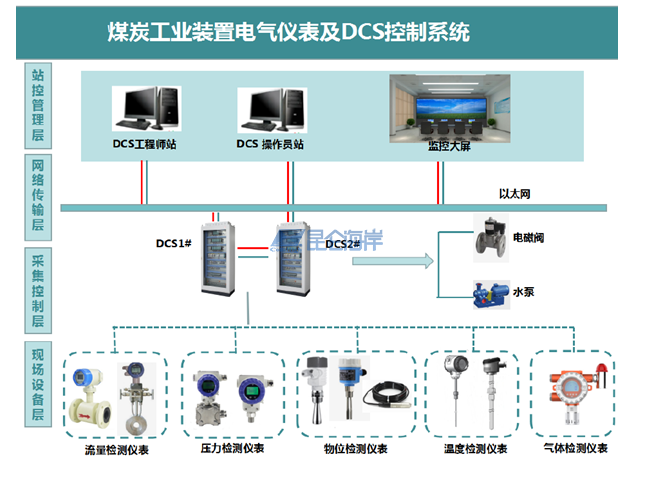 过程监测仪表和DCS 控制系统在煤炭生产工艺过程中有效的实现了生产过程的控制,监测管理,同时也是整个系统信息集成的基础,是联系生产过程和管理系统的纽带,