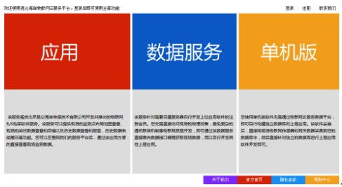 8868登陆入口物联网云平台采取会员制,用户可以用任意浏览器访问www.klha.net通用网址,注册并通过审核后,能使用网站提供的各项功能。平台功能分“应用”、“数据服务”和“单机版”三个不同的功能模块,分别采用“红”、“蓝”、“黄”三原色区隔,视觉感简洁突出易于辨认选择。