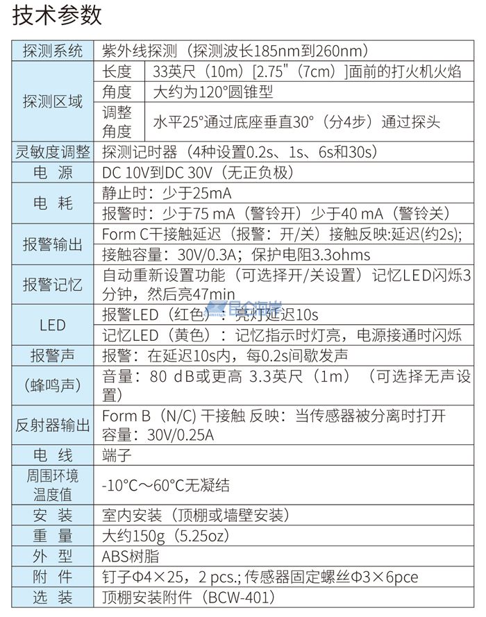 1、可探测到火焰中的紫外线,并予以警报。