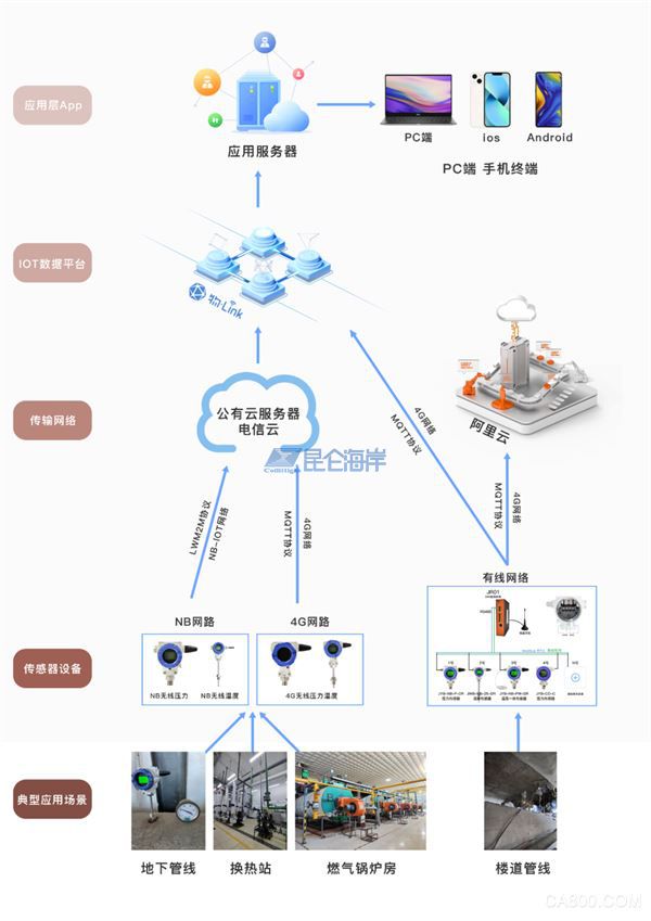 智慧热力监控系统,最典型场景有三类,分别是地井管网热力监控、楼道管线温度压力监控和锅炉房热力监控。系统整体的网络结构如下所示: