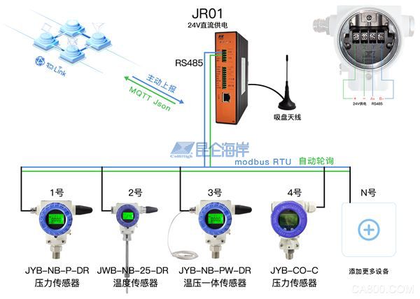 JR01系列4G边缘网关通过RS485接口可以同时采集64台设备的采集数据,通过直流24V对整个系统进行供电,具有如下的特点:4G通讯方式采用MQTT传输协议,通讯稳定可靠;MQTT协议对服务器的系统资源占用率低,适合大批量部署;传感器免配置,接入传感器网关自动读取数据;出厂上报频率1分钟,用户可根据系统需要远程修改上报频率;支持远程配置网关和传感器的功能,例如可远程消除传感器的零点误差值和数据采集的偏移量,从而实现数据的二次修正功能;采集的数据自动上报到物LINK服务器也可以直接上报到客户的私有数据平台。