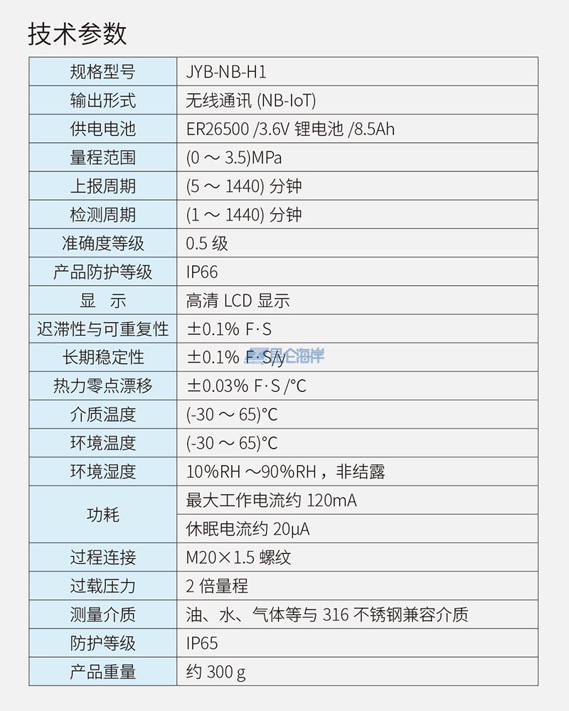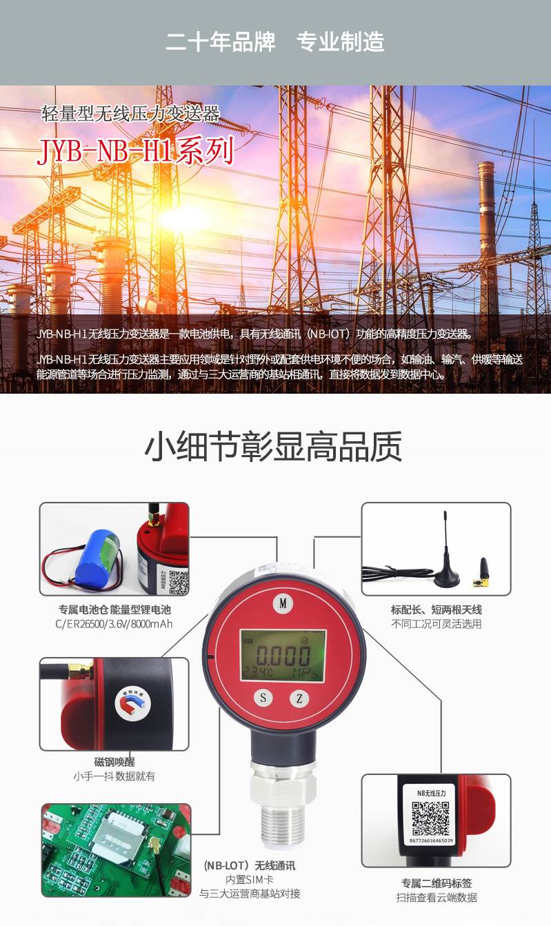 JYB-NB-H1 NB压力变送器是一款电池供电,具有无线通讯(NB-IOT)功能的高精度压力变送器。