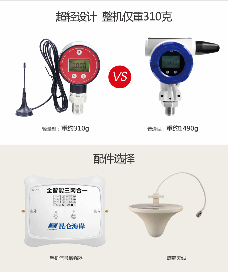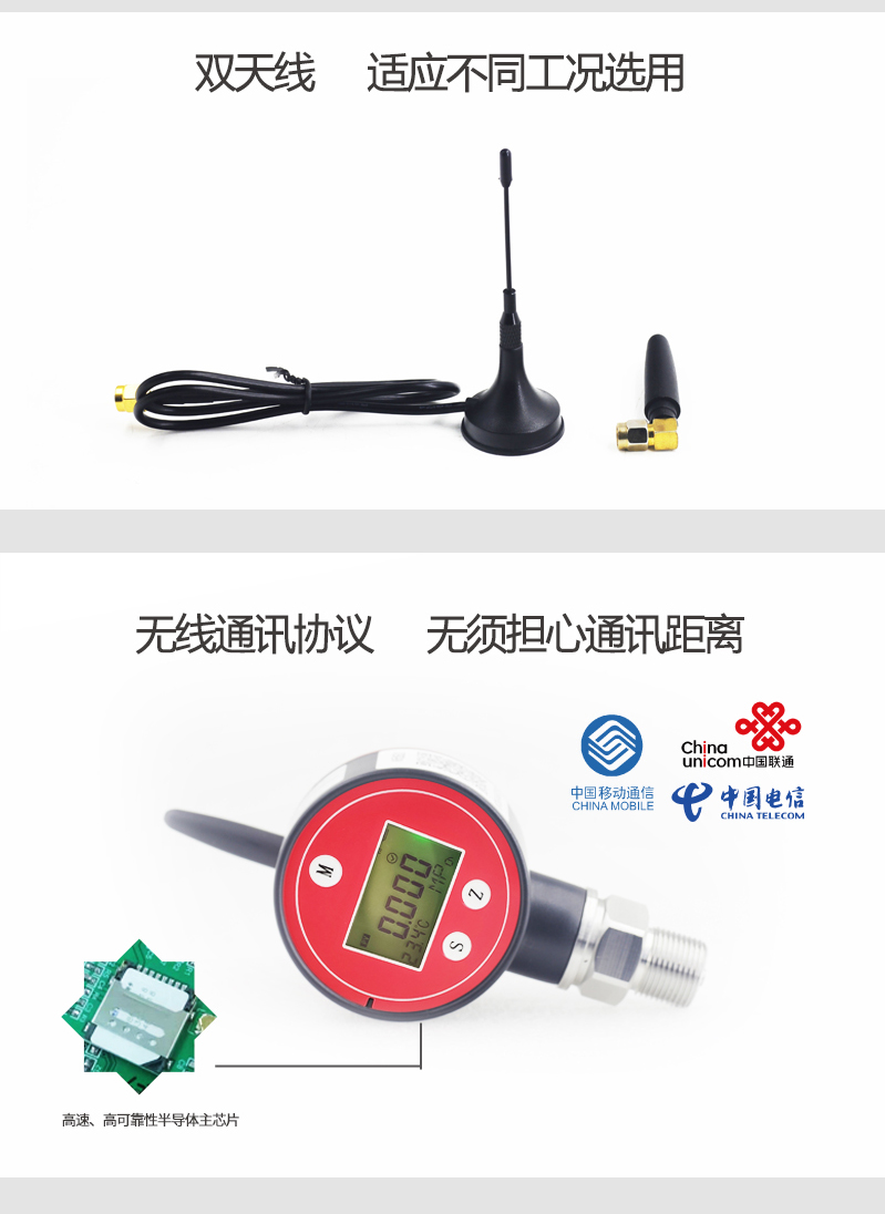 本产品主要应用领域是针对野外或配套供电环境不便的场合,如输油、输汽、供暖等输送能源管道等场合进行压力监测,通过与三大运营商的基站相通讯,直接将数据发到数据中心。