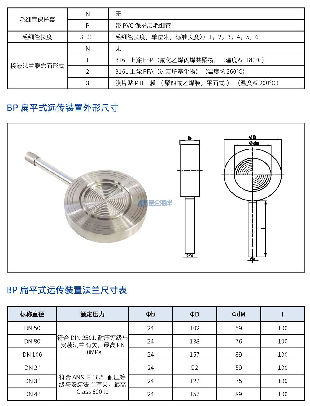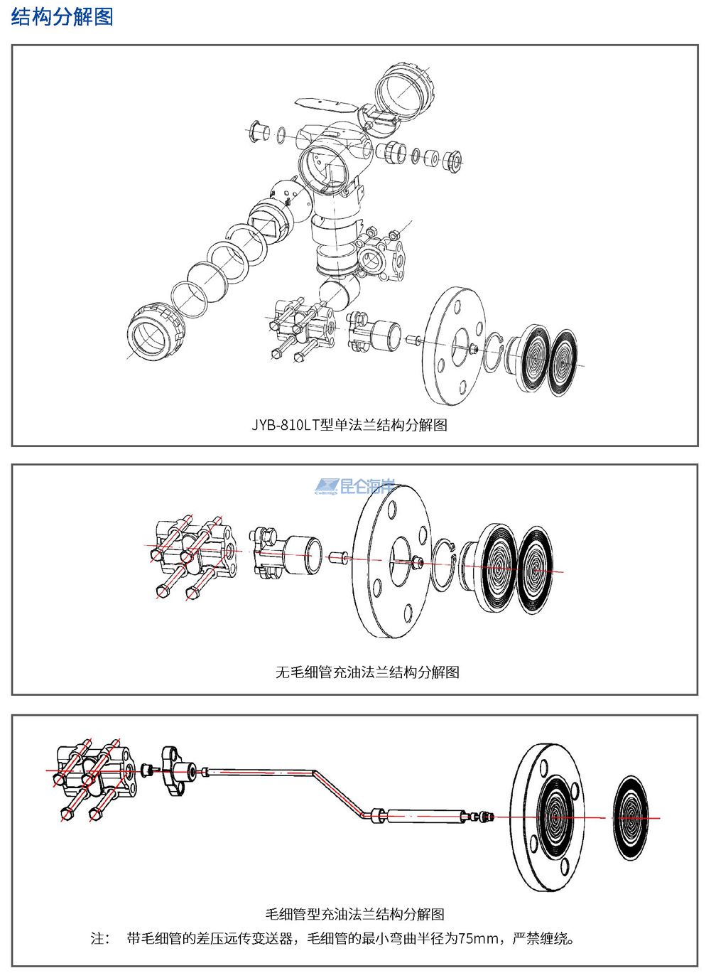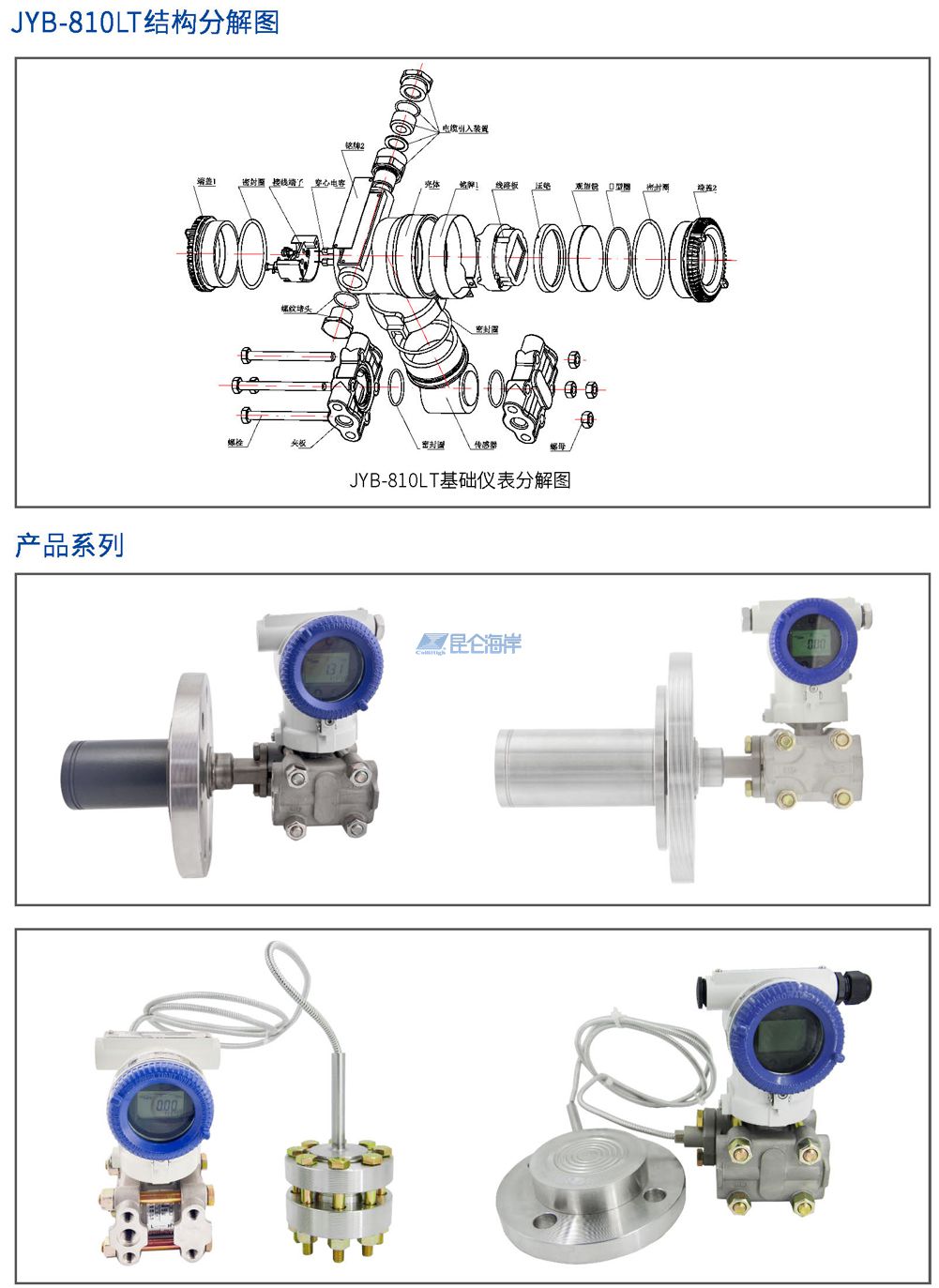JYB-810LT型法兰安装式智能压力/差压变送器,在结构上,由表压/绝压变送器和经焊接安装的带毛细管的远传法兰组成。作用在远传法兰侧的压力,首先经远传法兰上的膜片和填充液,再经毛细管,最后到达测量传感器的测量端。然后将压力信号转变成4~20mA DC 电流信号输出。