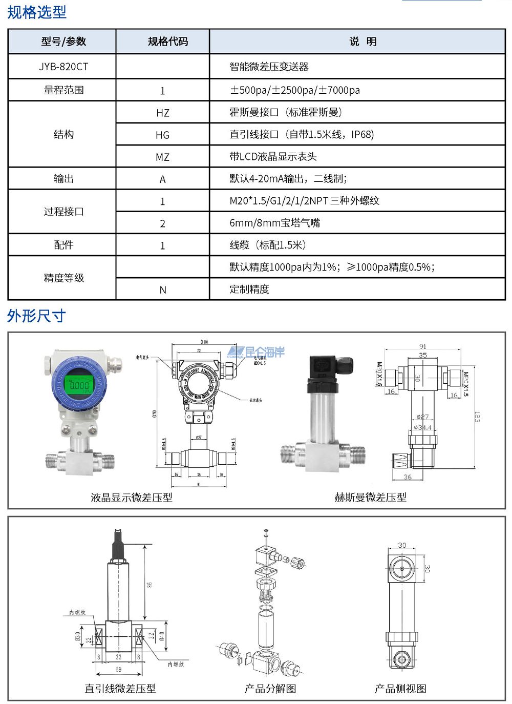 JYB-820 CT型智能微差压变送器是一款高精度、高稳定的压力测量产品。 该产品采用的数字技术是传感器制造领域的最新应用成果,结合国际先进的压阻式压力变送器设计制造技术,进行精密数字化温度补偿和非线性修正。外壳为全不锈钢结构,具有很强的耐腐蚀性,两个压力接口为M20X1.5螺纹连接(用户可选择压力接口尺寸),可直接安装在测量管道上或通过引压管连接。