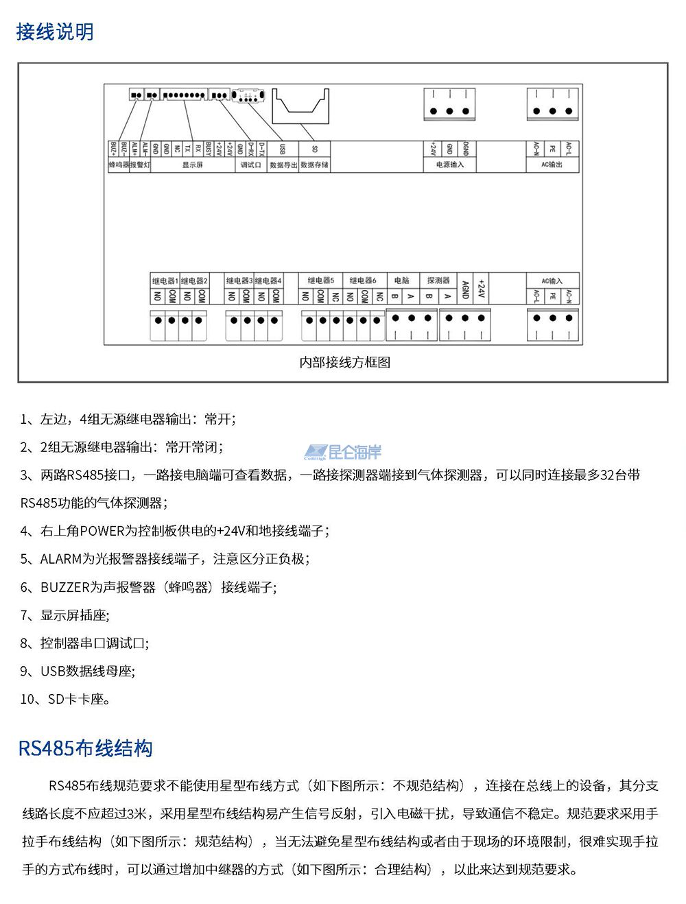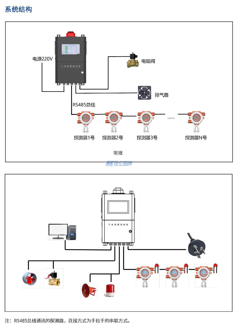 气体控制主机由主控板,参数控制板,彩色显示屏,声光报警器,开关电源等部件组成,还内置了6组无源触点继电器,用于控制风机、电磁阀等外部设备;该产品的设计遵循国家相关标准,具有响应速度快,抗干扰能力强,可靠性高,易于维护等优点。
